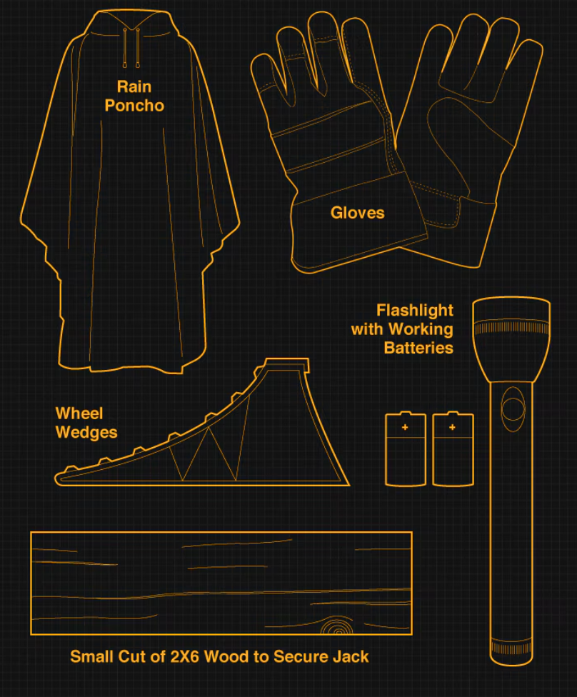 برای اینکه کارتان سریع و بی‌دردسر پیش برود، باید ابزار مناسب را در دسترس داشته باشید. قبل از شروع سفر، مطمئن شوید که این وسایل در خودرو شما وجود دارند و سالم هستند: